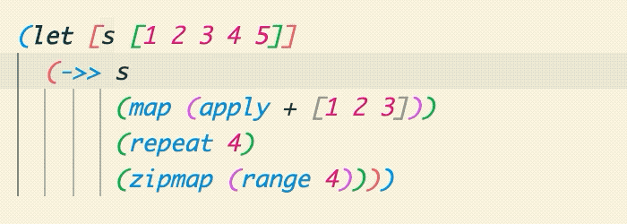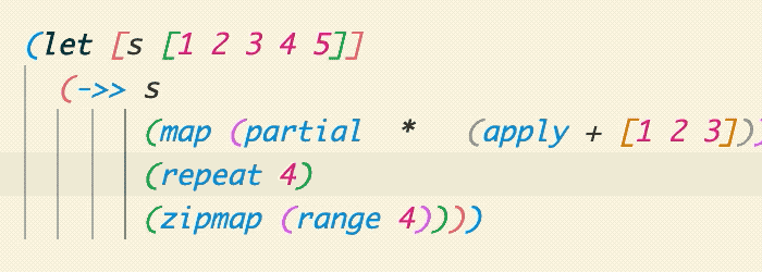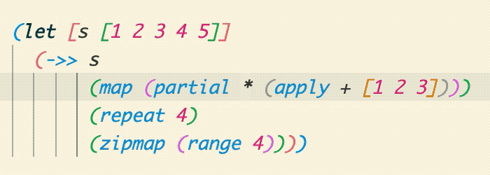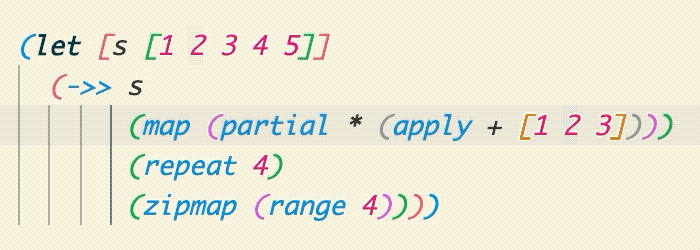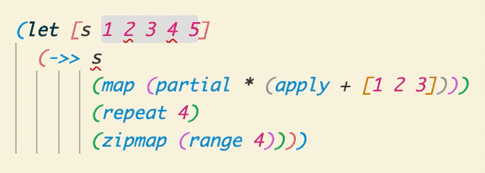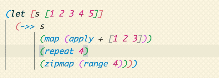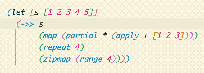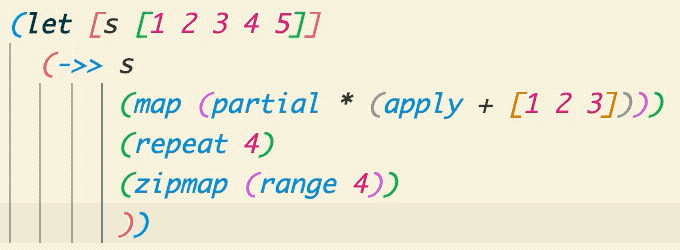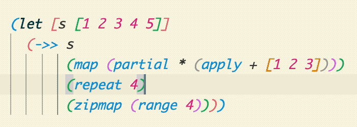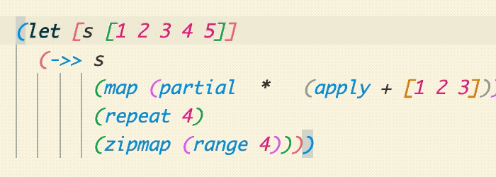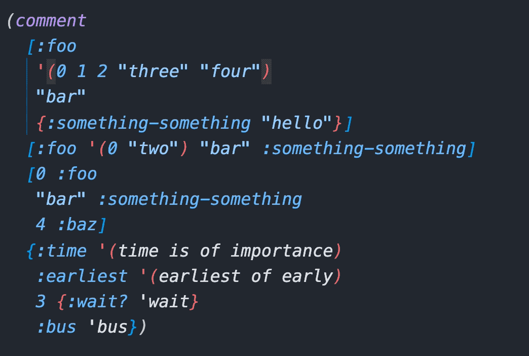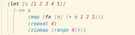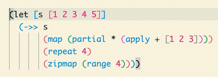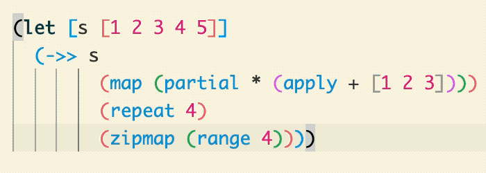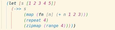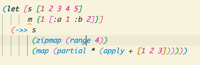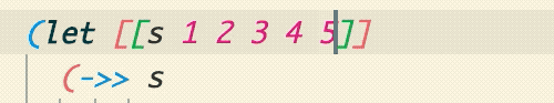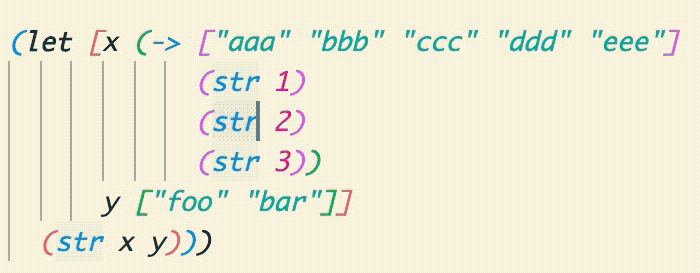 When dragging forms inside maps and binding boxes, such as with let, for, binding, etcetera, it often makes most sense to drag each binding as a pair. And this is what Calva will do. Like so: